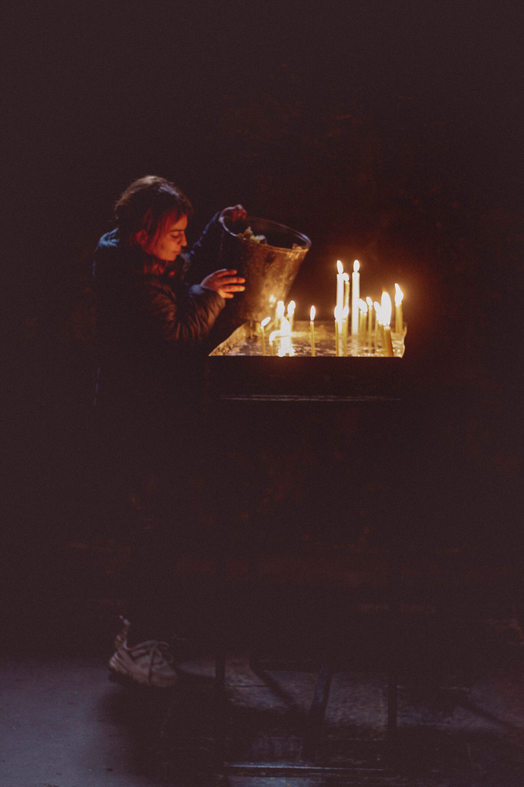 Pitkän päivän jälkeen on havaittavissa turnajaisväsymystä, ja vaikka Haghartsin luostari puhuttelee minua kauneudellaan, en jaksa juurikaan tutustua siihen. Tyydyn ottamaan yleiskuvia sekä kurkkaamaan nopeasti avonaisesta ovesta. Sisällä on hämärää, ja kattoaukosta suodattuva valo osuu suoraan alttarille. Jostain taustalta kuuluu, kun joku alkaa rukoilla.