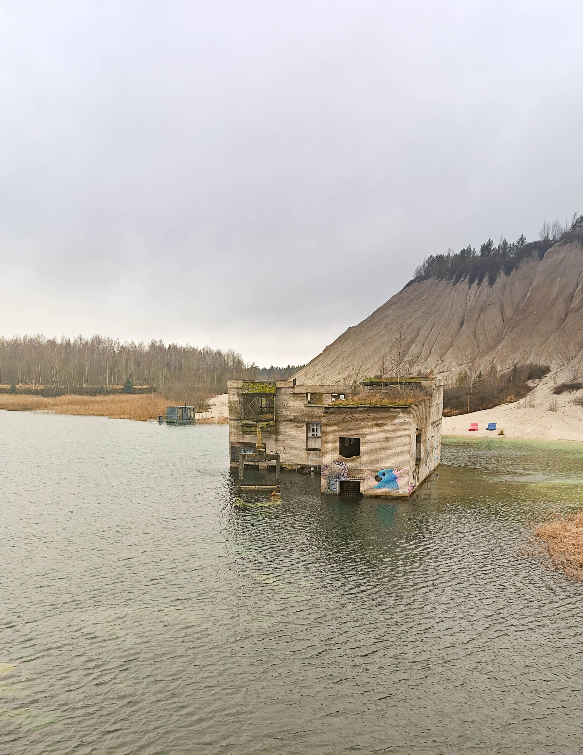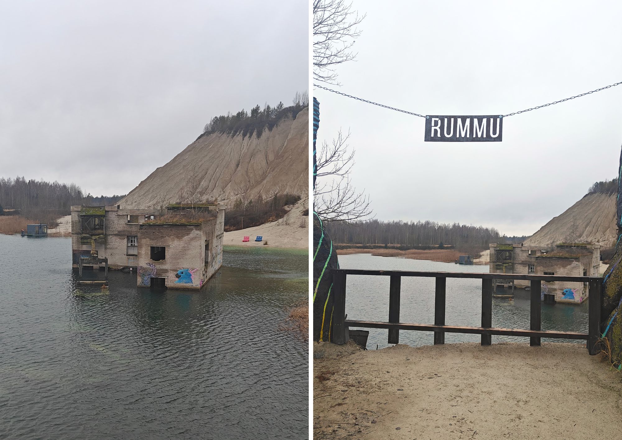 Käydessäni Rummussa järven vesi ei vielä ollut jäätynyt. Luin kuitenkin jostain, että järven jäätyessä paikka on suosittu luistelupaikka, sillä vesi on niin kirkasta, että jään läpi pystyy näkemään pohjaan saakka, jolloin veden alle jääneet talot, työmaakoneet ja työkalut ovat silloin hyvin näkyvissä.